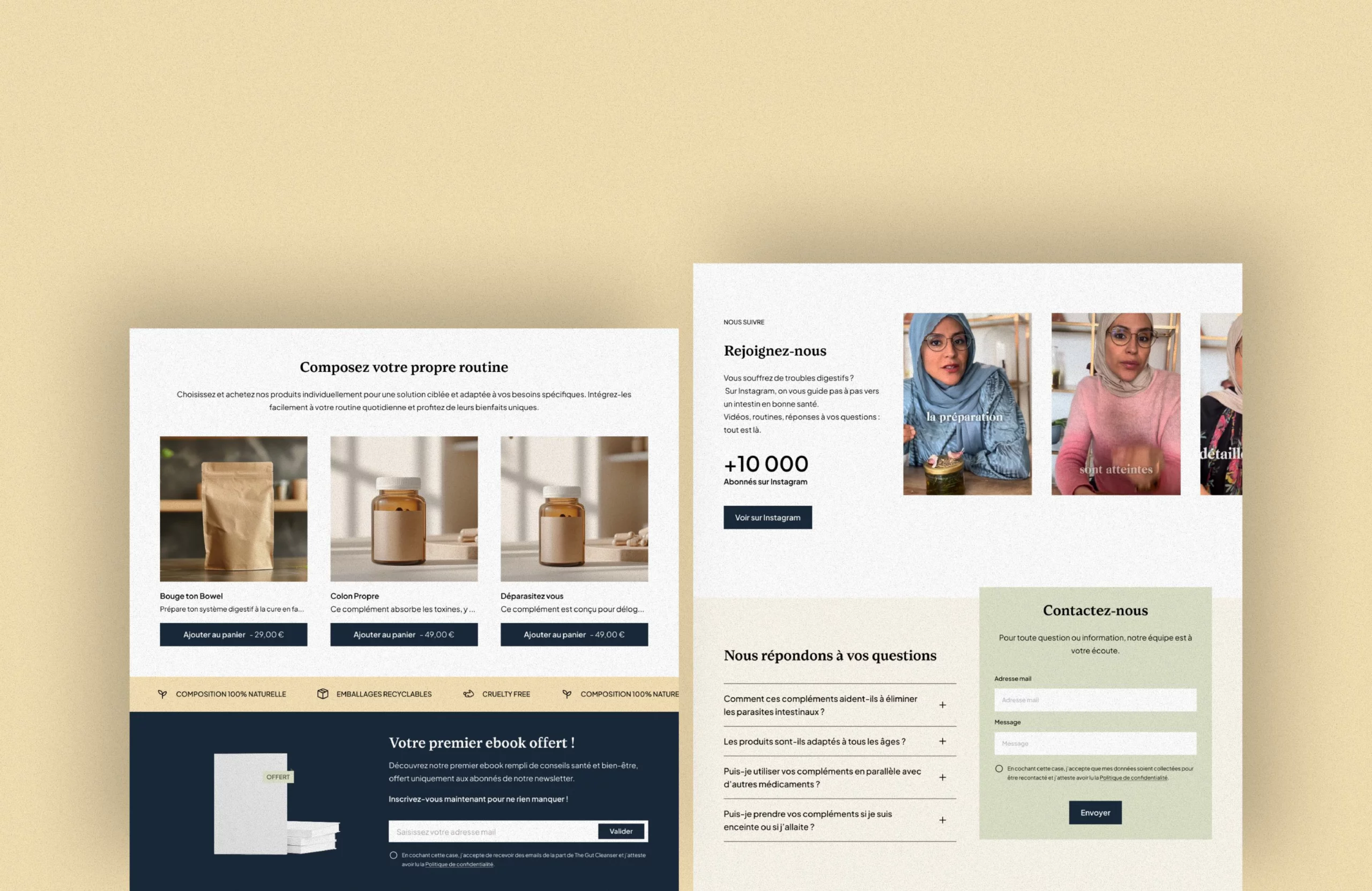 Pour commencer, nous avons créé une planche d’inspiration : c’est à ce moment que se sont précisées les pistes concrètes. Par la suite, nous avons conçu un UIKit à partir de la charte graphique réalisée en amont. Nous avons ensuite pu commencer à créer les wireframes. L’objectif était clair : mettre en avant, dans le hero, les trois avantages principaux des produits. Ensuite venaient une section à propos de la marque, les produits proposés, des éléments de réassurance, l’ebook offert, une partie dédiée aux réseaux sociaux, puis, pour finir, les sections contact et FAQ.
